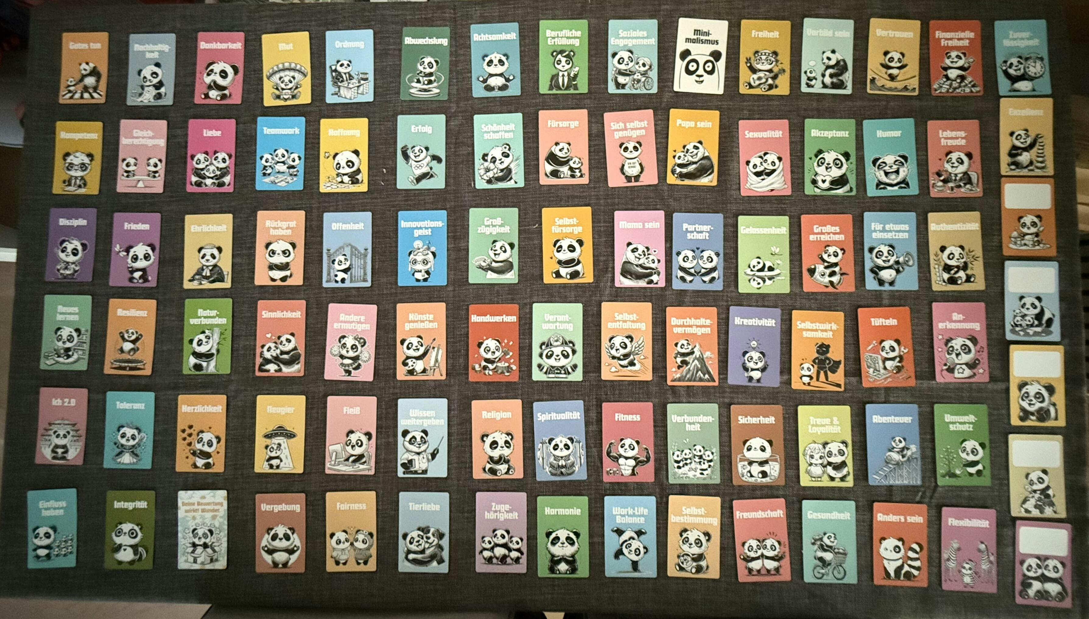 Die Karten sind sehr schön / liebevoll mit süßen Pandas gestaltet und passenden Zitaten auf der Rückseite. Es sind auch Karten dabei, auf denen man weitere Werte ergänzen kann.