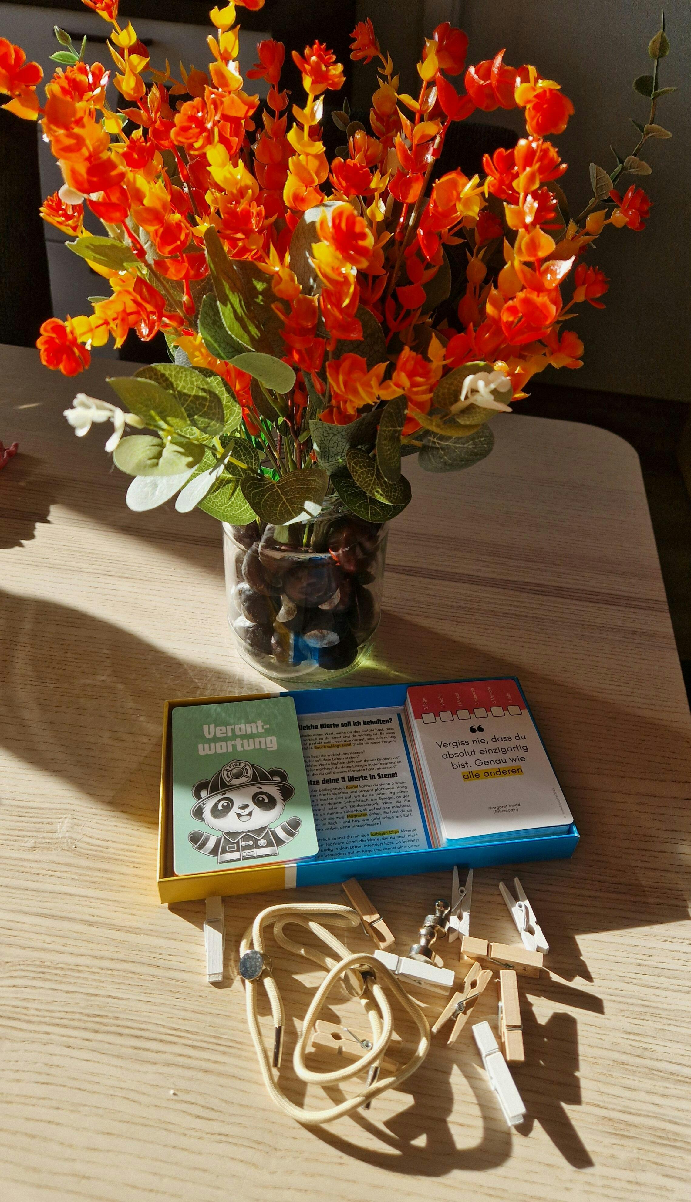 Das Kartenset ist einfach wundervoll! Die Werte sind toll und wunderschön illustriert. Alles einfach und klar erklärt. Und außerdem sind Kordel, Klammern und Magnete auch schon dabei, so dass die dafür benötigte Energie nicht mehr so hoch sein muss. Einfach toll! Ich kann es nur empfehlen! Meine Familie ist auch begeistert!