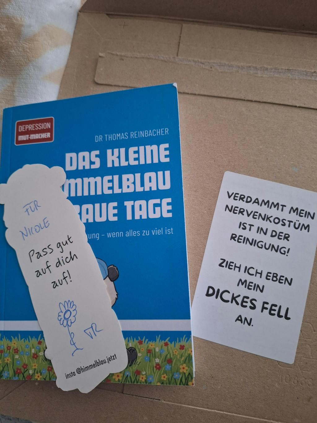 Seelenwärmer mit Witz, allerdings hier und da ganz tiefsinnig und dunkel und habe mich hier und da verstanden gefühlt und wiedergefunden. Die Seite von deiner Frau fand ich gut, da Nichtbetroffene noch mehr leiden. Die Bilder dazu haben mir ein Lächeln gezaubert. Wirklich süß. Vielen Dank auch für die Widmung mit meinem Namen. Ich habe mich sogar sehr über die Verpackung gefreut. Dann wurde mein dunkler Tag für einen Moment heller.