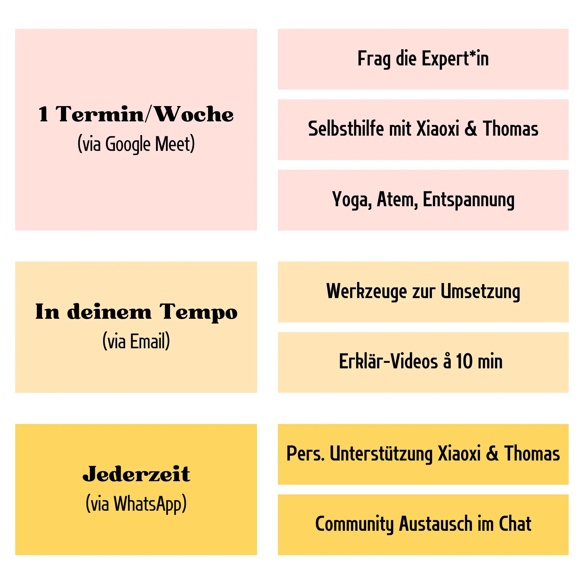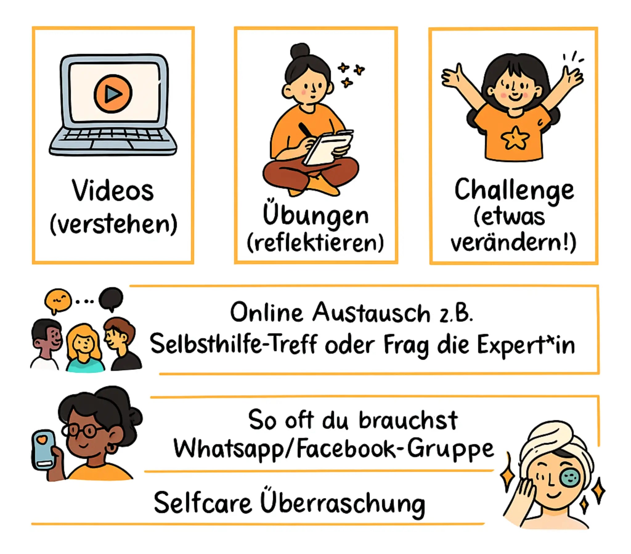 Zum Startdatum bekommst du Zugang zu allen Inhalten. Die Videos und Übungen schalten wir Schritt für Schritt frei. Dazu gibt’s Austausch in der Gruppe und Live-Sessions.